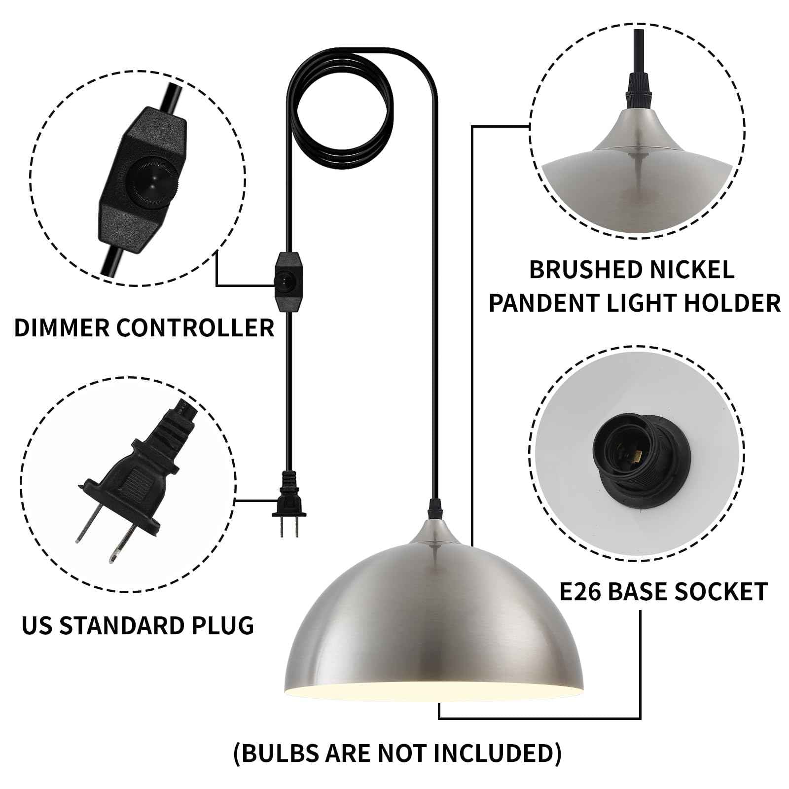 Easy to Install:The installation steps for this industrial pendant light are very simple, you just need to fit the included hooks in the right places and then plug it in and it's ready to use. This Brushed Nickel pendant light is an E26 base, which is suitable for most bulbs on the market. In addition, I have a brightness adjustment on the cord to adjust the brightness according to the usage scenario